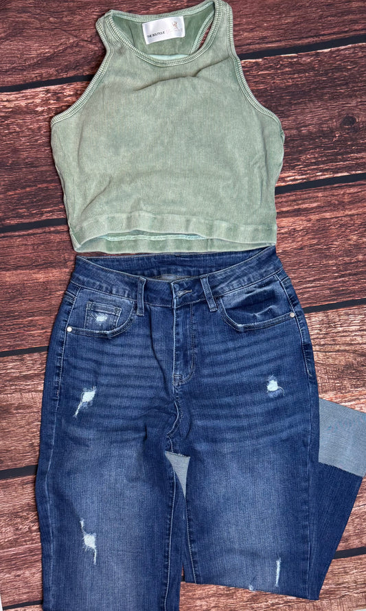 Light Grey Ribbed Mineral Wash Racerback Cropped Tank Top