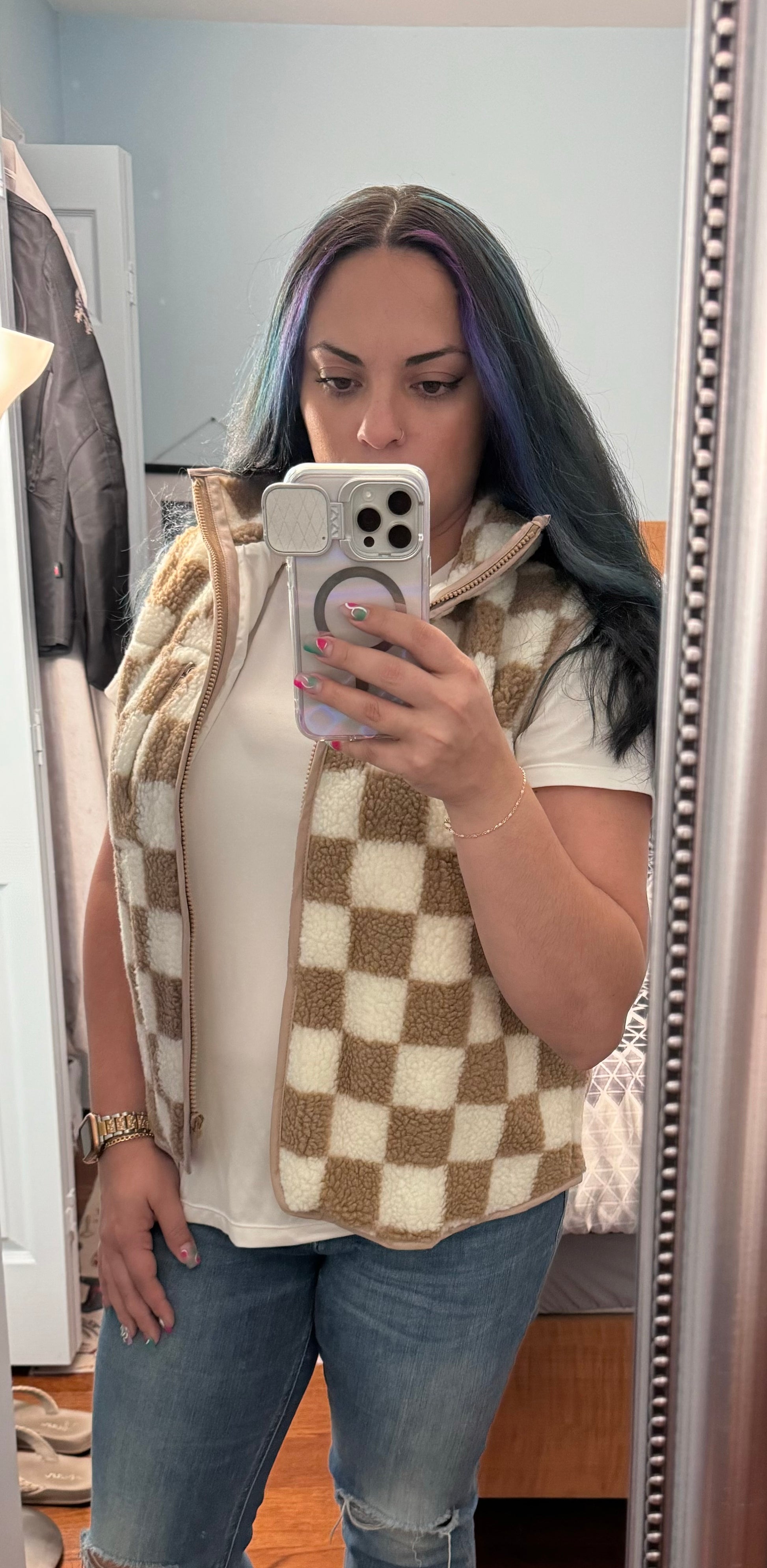 This winter vest is warm and soft with Sherpa made. The checkered pattern makes it chic and popular. It’s cozy fit with a full zipper and stand collar. This Sherpa vest is perfect for layering.